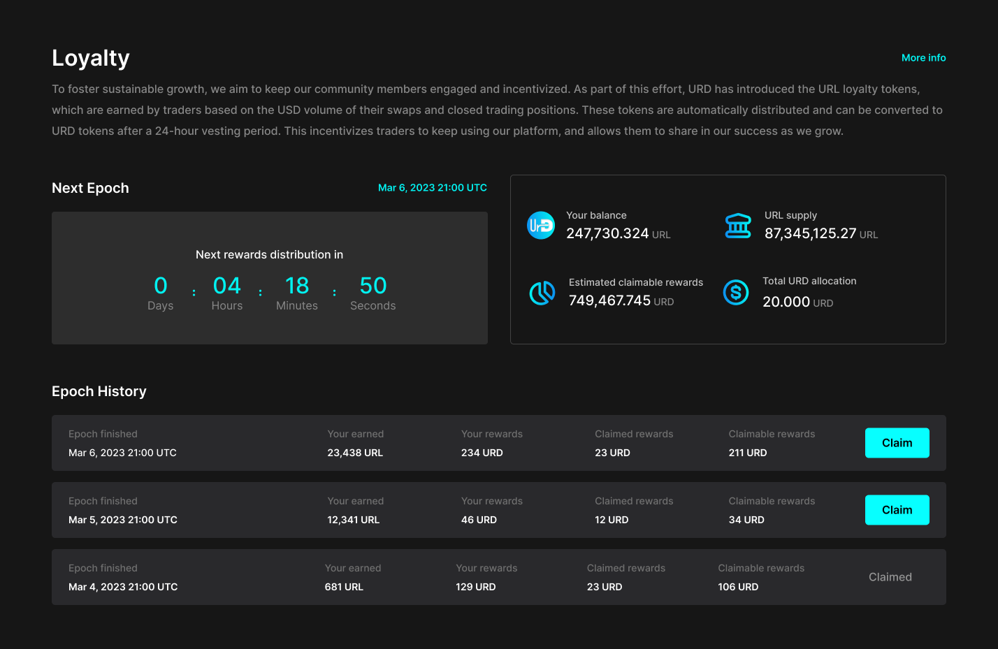URL loyalty tokens can be earned by traders based on the USD volume of their swaps and closed trading positions. These tokens are automatically distributed and can be converted to URD tokens after a 24-hour vesting period. This incentivizes traders to keep using our platform, and allows them to share in our success as we grow.
