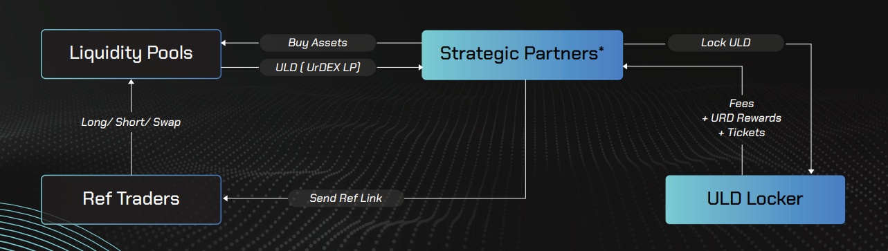 Lock an amount of URD for a period of time to become a strategic partner and earn rewards. For example, you will need to lock at least $50k of ULDs (Urdex Liquidity Providers) value within 3 months.